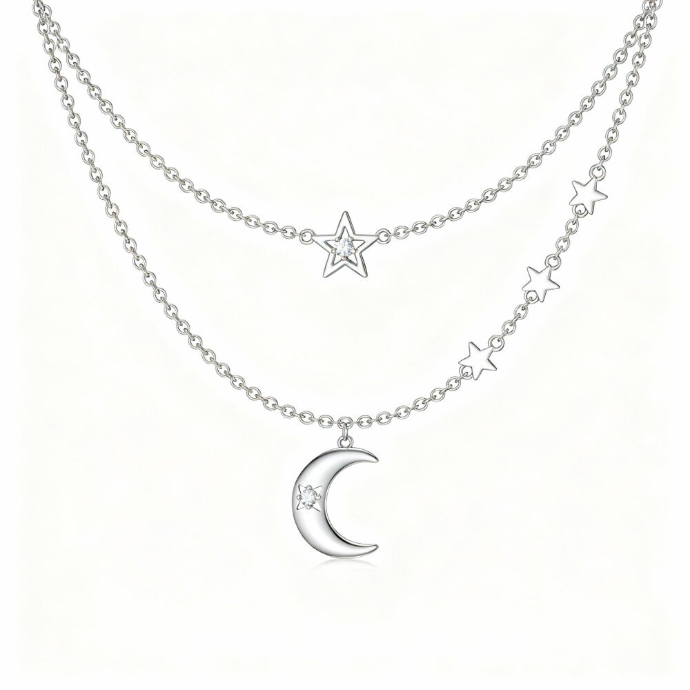 Descubra nosso colar em Ouro Branco 10K em camadas que combina elegantemente a beleza celestial com zircônias cúbicas cintilantes, projetado exclusivamente para mulheres.