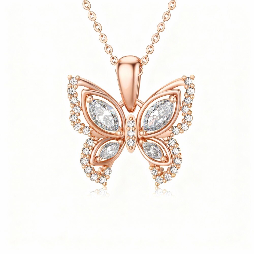Elevate your style with our stunning 14K Rose Gold butterfly pendant necklace, adorned with sparkling cubic zirconia and scintillating moissanite stones. Perfectly designed for women who appreciate elegance, this exquisite piece adds a touch of sophistication to any outfit, making it an ideal gift for special occasions or a delightful treat for yourself.