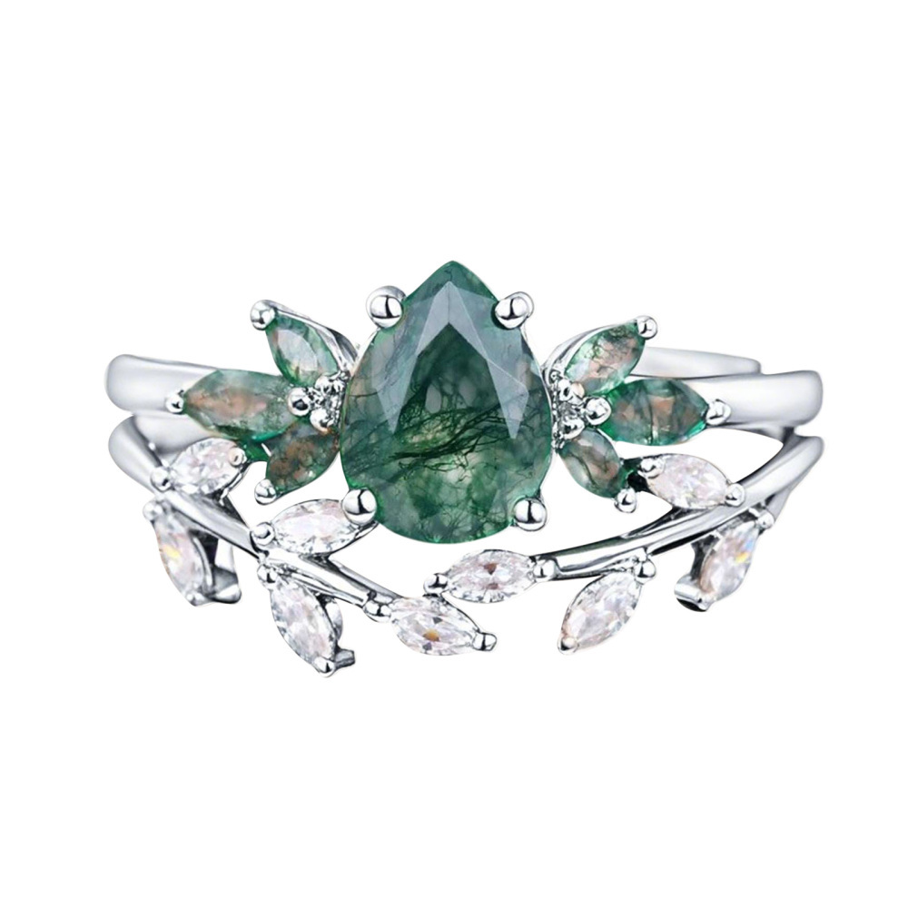 Este encantador conjunto nupcial apresenta ouro branco de 14 quilates meticulosamente polido, destacando um artesanato excecional com um excelente corte, simetria e um peso total em quilates que varia de 1 a 6 CT. Delicados motivos de folhas entrelaçam-se no design, simbolizando o amor e o crescimento, enquanto a vibrante pedra central de ágata musgo é complementada por 0,3 CT de deslumbrantes pedras laterais de moissanita, garantindo que o seu dia especial brilhe com uma elegância intemporal.