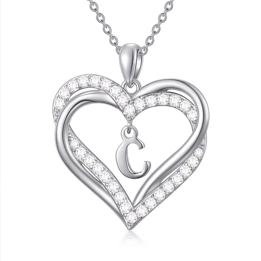 Descubra o nosso requintado colar com pendente em forma de coração em prata de primeira lei, com uma deslumbrante zircónia cúbica no centro, personalizado com a letra inicial “C” e revestimento a ouro branco - perfeito para mulheres que apreciam a elegância e o toque pessoal.